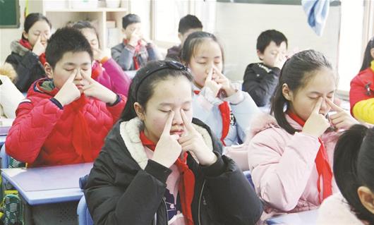 图为:江岸区鄱阳街小学建立日常眼保健操制度,并用阳光电视台、宣传栏等宣传科学用眼、预防近视等眼保健知识,培养学生爱眼、护眼意识。