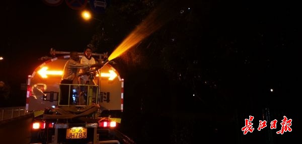 热浪稍退,路上车辆减少,19点,汉阳区园林绿化队15辆水车全部出动。长江日报记者跟随其中一辆水车,来到四新北路,为绿化带植物浇水。