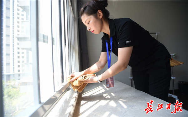 军运会住宿服务运营商保利酒店管理公司武汉分公司为军运村安排了600余人的客房服务人员,包括本地招聘人员及保利从旗下各个项目调过来支援的“精兵强将”,部分大学生也参与其中。他们4人一组,600多人在一个月内完成了整个军运村1958套房间的“精开荒”工作,目前他们正在为新房通风抹尘。