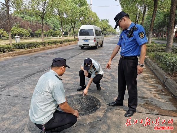 武汉开发区城管局工作人员正在复查井盖情况。(记者宋磊摄)