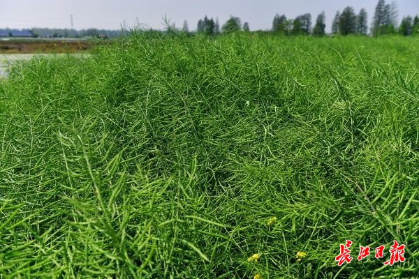 油菜已收花结果,满眼青绿,肥壮的长角果挨挨挤挤,压弯了油菜秆。
