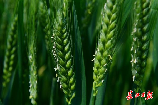 绿油油的小麦正在抽穗扬花,随风摇出绿色麦浪。